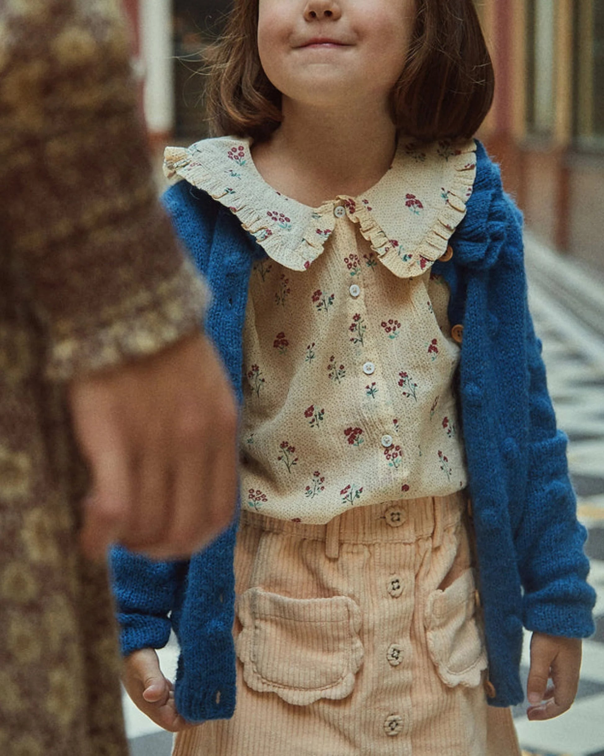 Une bien jolie mini-jupe en velours de coton à grosses côtes, bien épais et tellement doux. Elle est composée d'un empiècement dans le dos et de quatre panneaux montés sur une ceinture élastiquée pour épouser toutes les tailles. Les deux panneaux de devant se ferment avec des boutons recouverts de tissu et accueillent chacun une ravissante poche fleur plaquée. Ceux du dos sont dotés chacun d'une poche plaquée et surpiquée. Plein de combinaisons possibles pour mettre ses mains au chaud ou pour dissimuler ses petits trésors.