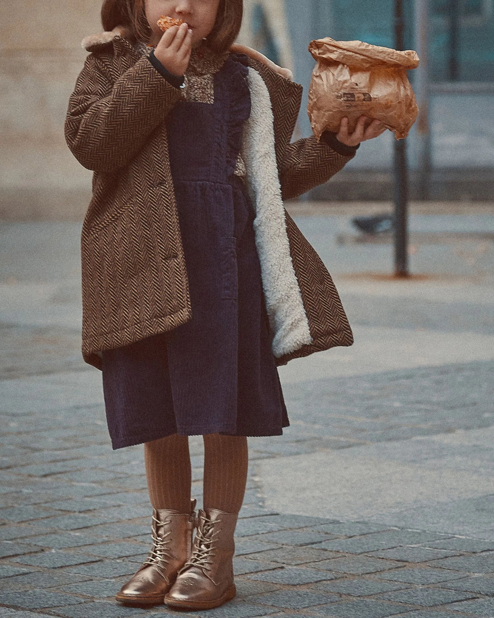 Manteau en laine à chevrons beige et noir. On aime le dessin du tissage, le grand col en fausse fourrure beige qui remplace l'écharpe -interdite dans les écoles-, les 2 poches passepoilées qui sont bien utiles pour garder les mains au chaud ou pour ranger quelques trésors. Le corps du manteau est entièrement doublé de fourrure douce et isolante. Le bord-côte noir sous les poignets évite au vent de s'engouffrer dans les manches. Bien chaud, ce manteau prémunira vos filles contre les rigueurs de l'hiver.