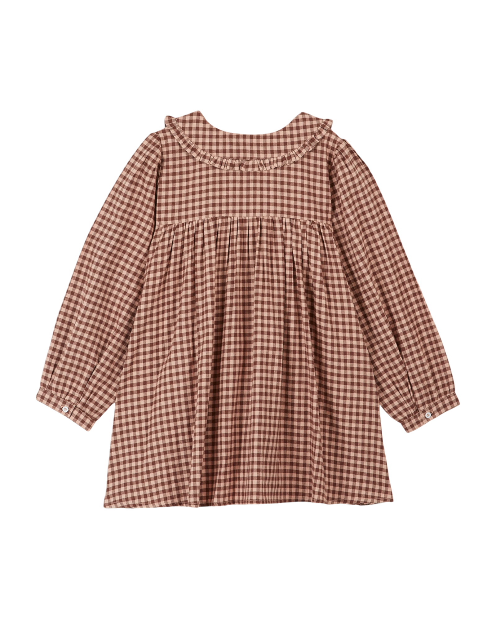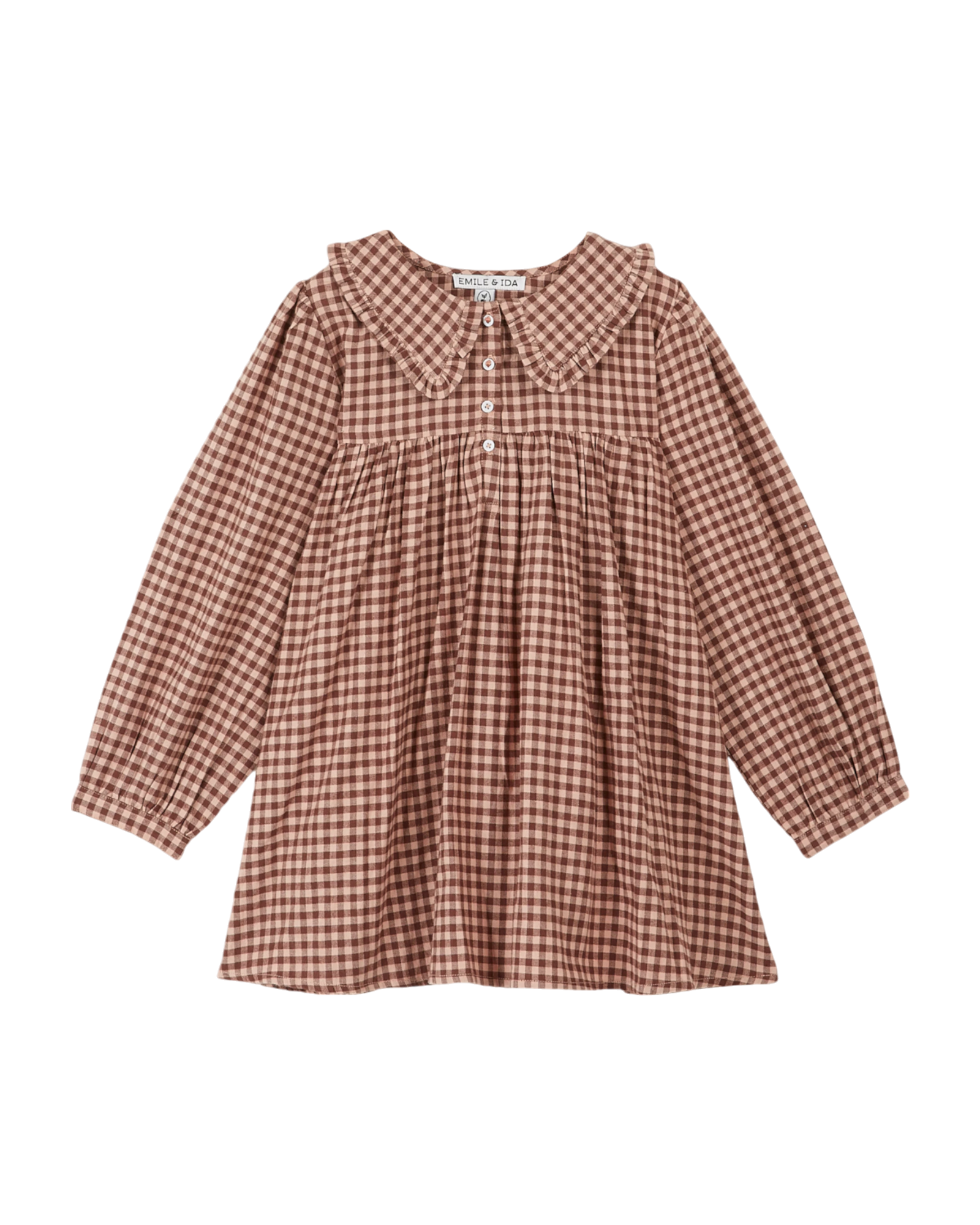 Robe en coton vichy chocolat et rose. Il n'y a pas que l'été à Saint-Tropez qu'il est possible de porter du vichy. Vous aimerez la matière toute douce et la forme ample que procurent les fronces soutenues par les empiècements devant et dos. Manches longues resserrées par une manchette boutonnée, patte de boutonnage sur la hauteur de l'empiècement accompagnée de ses boutons en nacre naturelle et le col plat agrémenté d'un petit volant. Vient ensuite le détail qui rend cette robe unique : les fleurs brodées à la main sur les boutons. Puis le détail que vous ne voyez pas : les assemblages sont exécutés en couture anglaise ce qui prolonge la durée de vie de la robe.