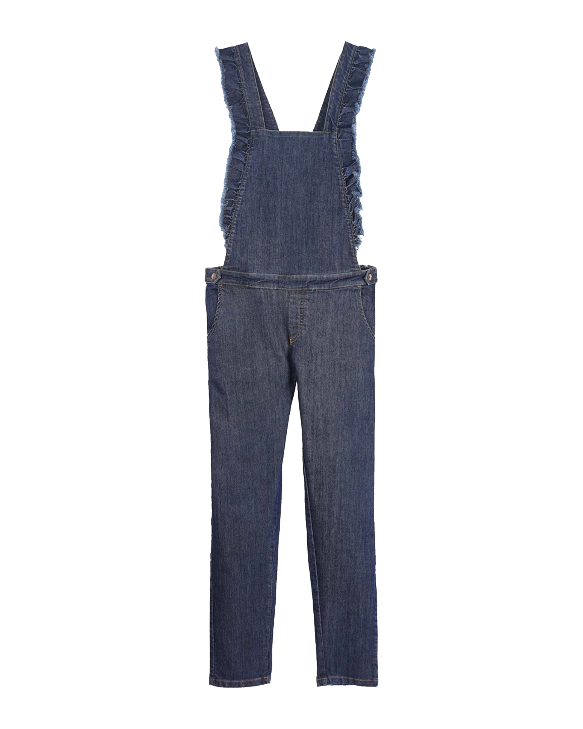 Salopette iconique Émile et Ida en denim stretch. Avec des volants sur les bretelles croisées et ajustables dans le dos et sur les bords de la bavette, cette salopette est une pièce devenue incontournable du dressing Émile et Ida. Le confort du denim est apporté par l'élasthanne. Cette matière synthétique confère l'élasticité au coton. Cette propriété, propre à l'élasthanne, permet à la matière à laquelle il est associé de reprendre et de garder sa forme quelques soient nos mouvements et leur répétition.