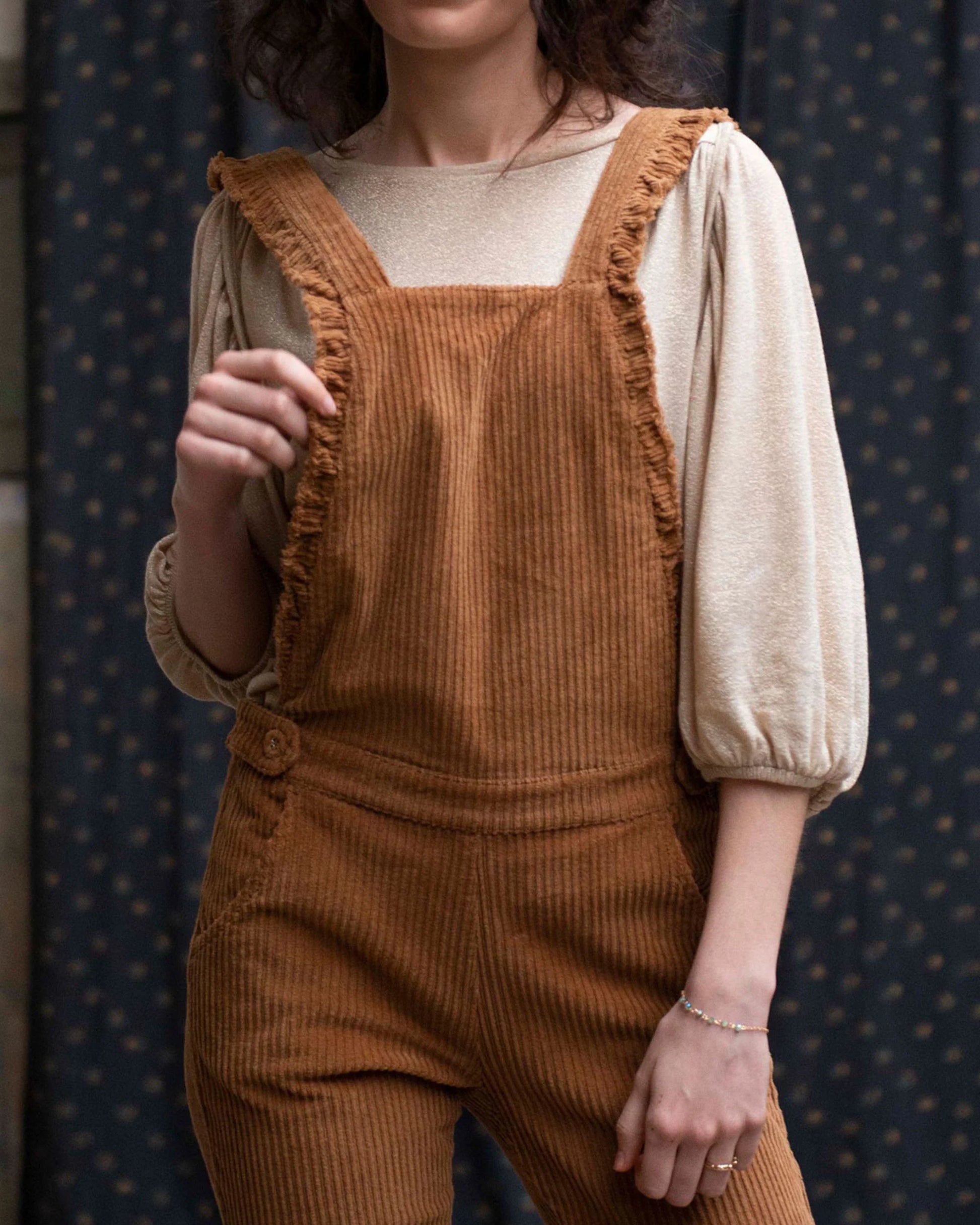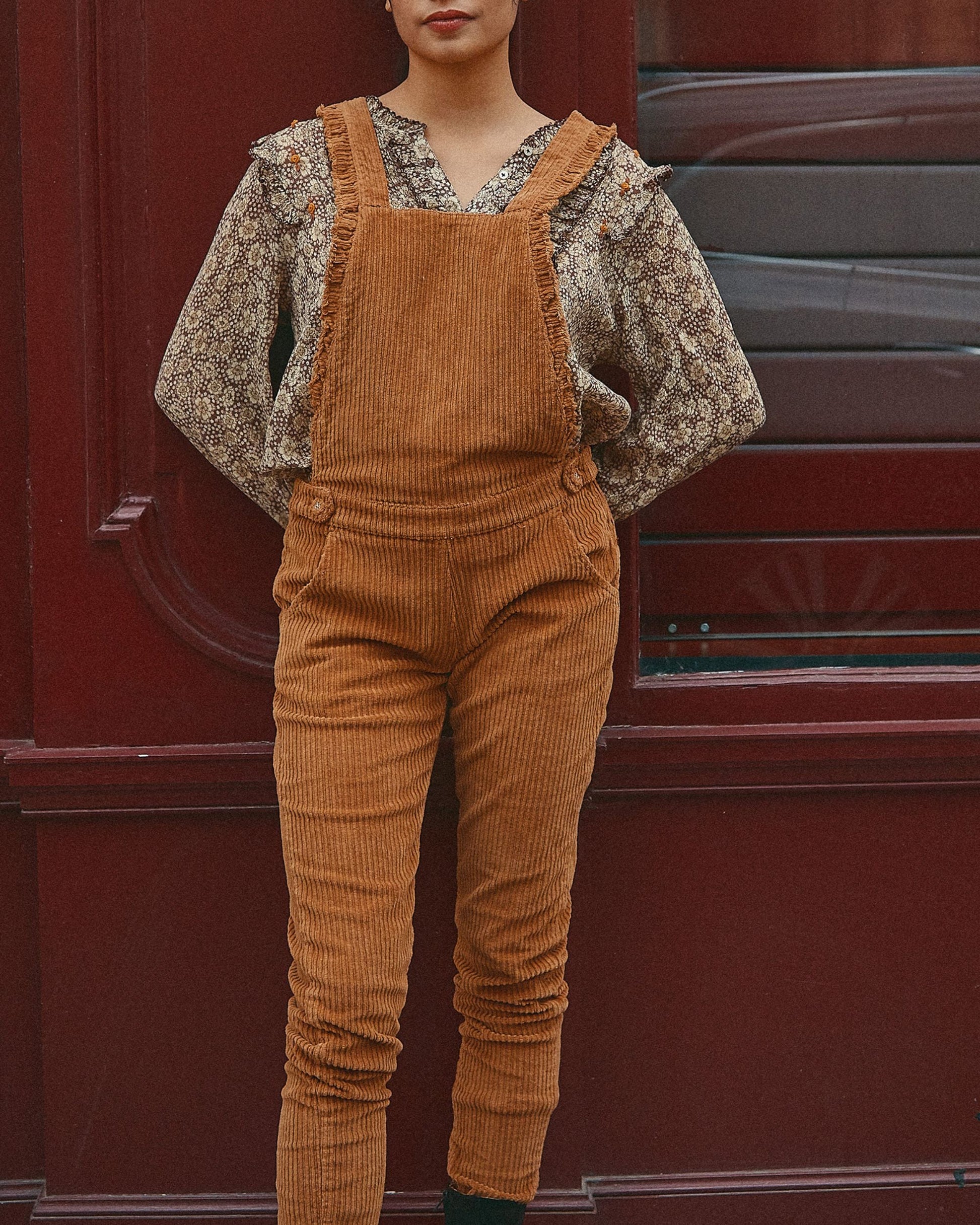 Salopette iconique Émile et ida en velours de coton stretch caramel. Avec des volants sur les bretelles croisées et ajustables dans le dos et sur les bords de la bavette, cette salopette est une pièce devenue incontournable du dressing Émile et Ida. Le confort du velours à grosses côtes est apporté par l'élasthanne. Cette matière synthétique confère l'élasticité au coton. Cette propriété, propre à l'élasthanne, permet à la matière à laquelle il est associé de reprendre et de garder sa forme quels que soient nos mouvements et leur répétition.