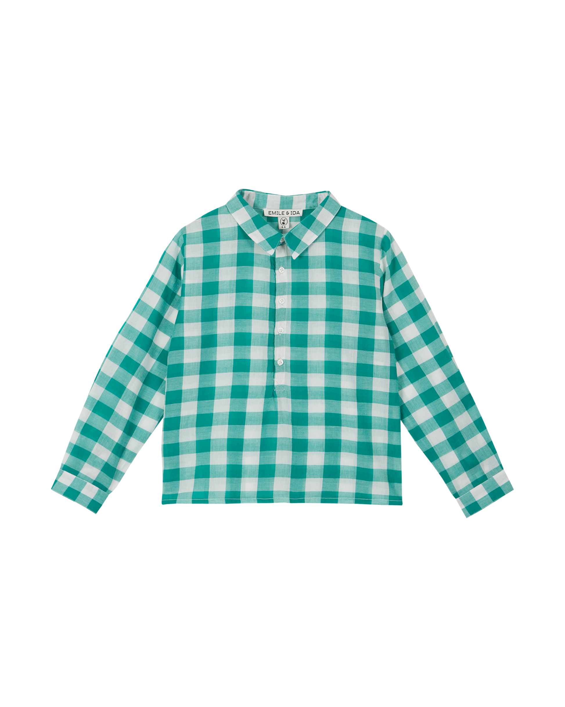 Kurta à manches longues en voile de coton vichy à gros carreaux blancs et verts. Avec le col monté sur un pied de col, la grande ouverture avec cinq boutons en nacre naturelle et les manches longues terminées par un poignet à double boutonnage.