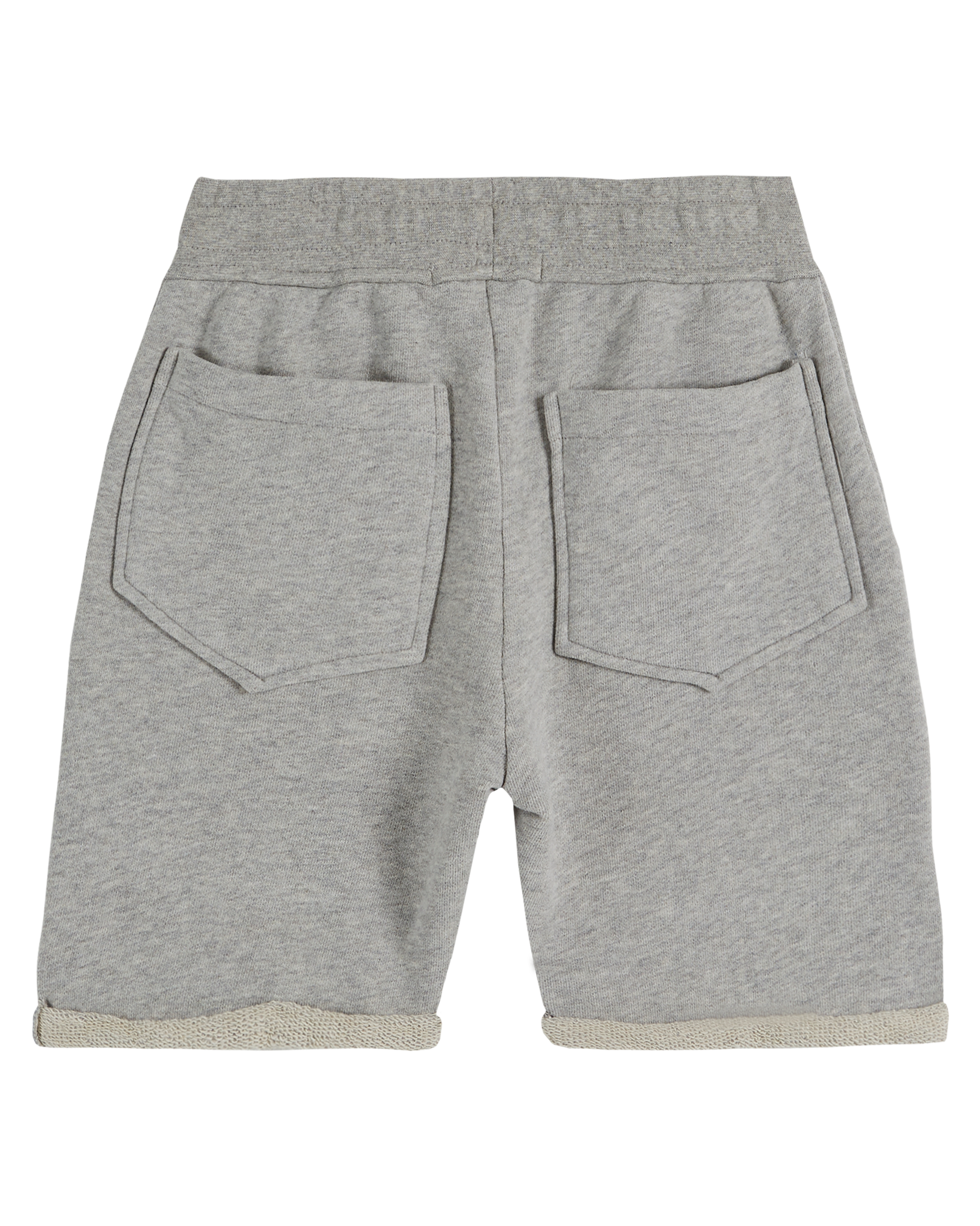 Bermuda en coton biologique molletonné gris chiné. N'êtes-vous pas séduit par le coton biologique qui répond à nos préoccupations écologiques ? Le bermuda est monté sur une ceinture en bord-côte extensible qu'il est possible d'ajuster avec le cordon en coton sergé ton sur ton. On aime les deux poches italiennes et les deux poches plaquées sur les fesses, le revers en bas des cuisses et les surpiqûres autour des poches et celles qui marquent la braguette factice.