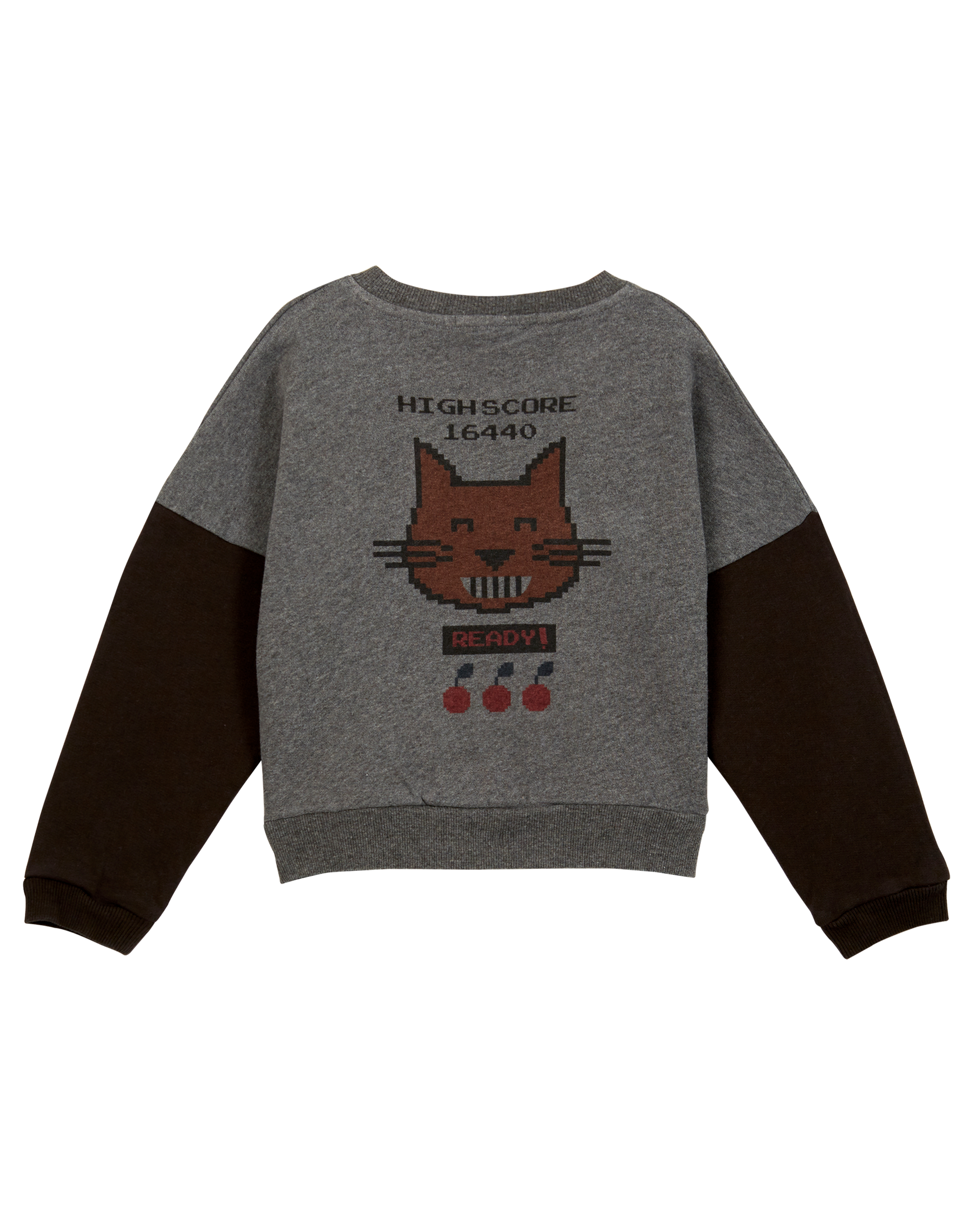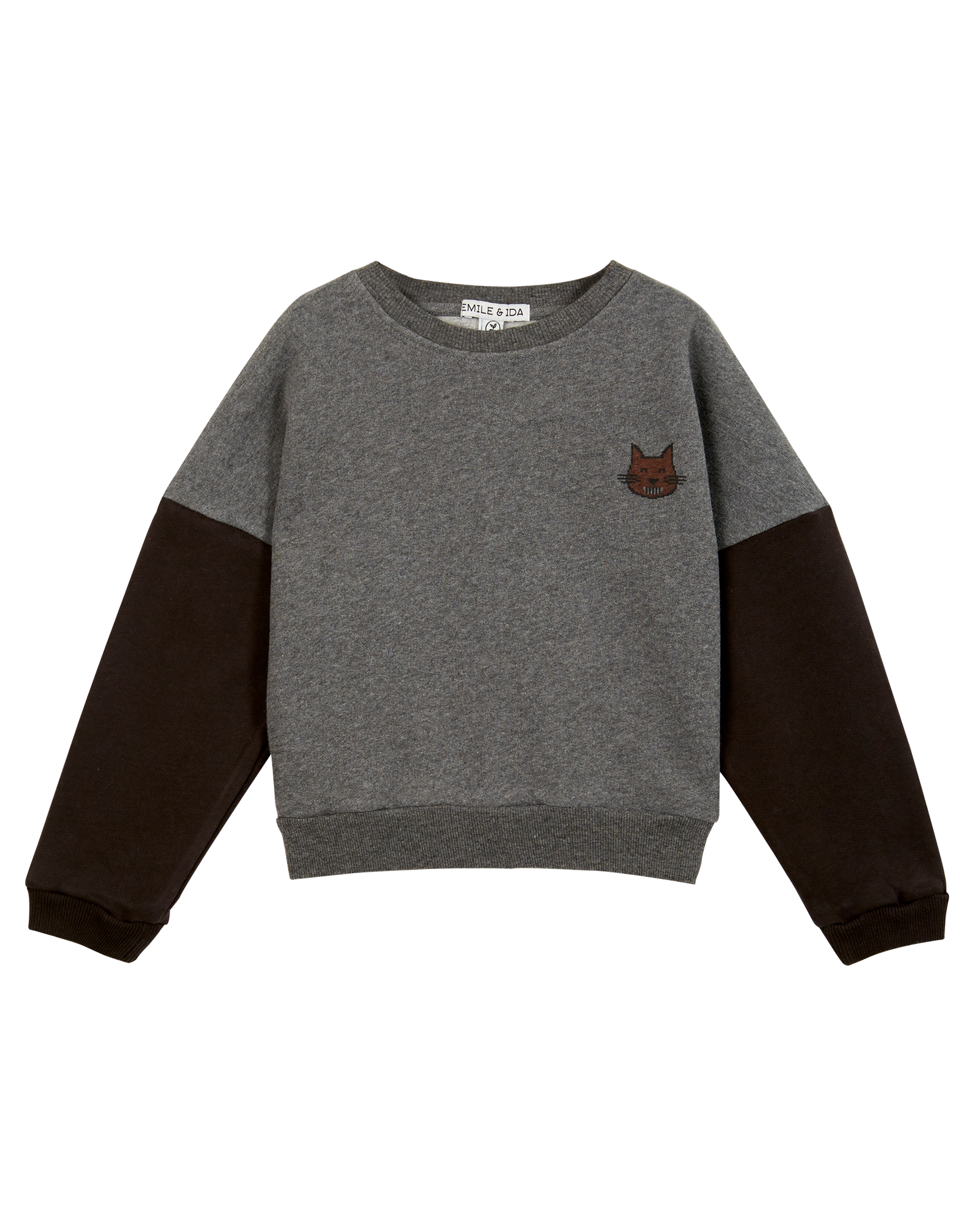 Sweatshirt en coton biologique molletonné et gratté gris chiné foncé et bitume. Nous utilisons du molleton gratté car, outre le côté duveteux, cela renforce le pouvoir isolant du coton. Emmanchures décalées qui induit une coupe ample, bord-côte ton sur ton, gris foncé autour de l'encolure ras du cou et à la base du sweat et bord-côte bitume aux poignets. Sur la poitrine on retrouve le museau de notre animal fétiche : le chat. Il peut être chat-touille, chat-loupe, chat-pitre ou chat-peau ! Pourvu qu'il ne fasse pas le chat-hutu.