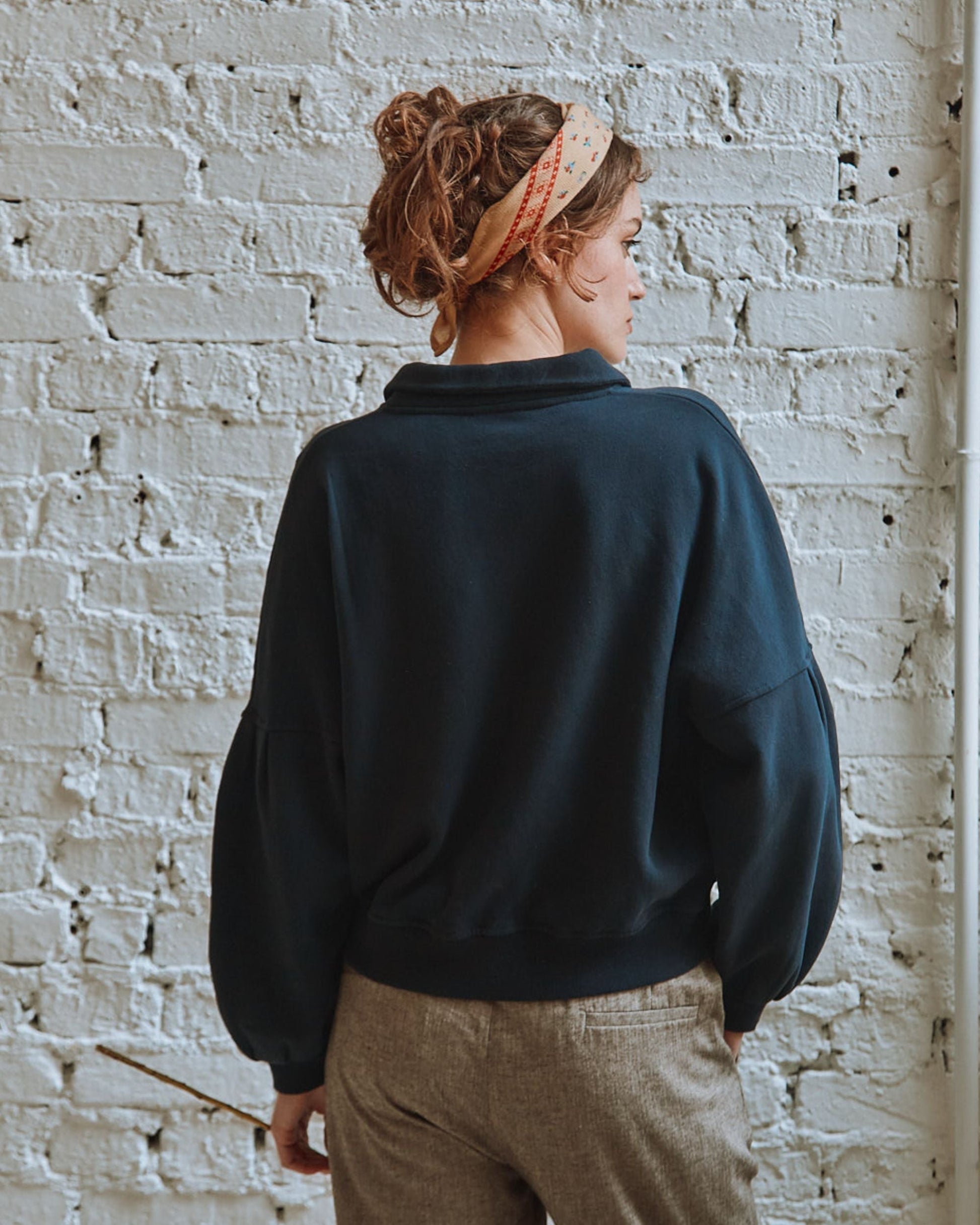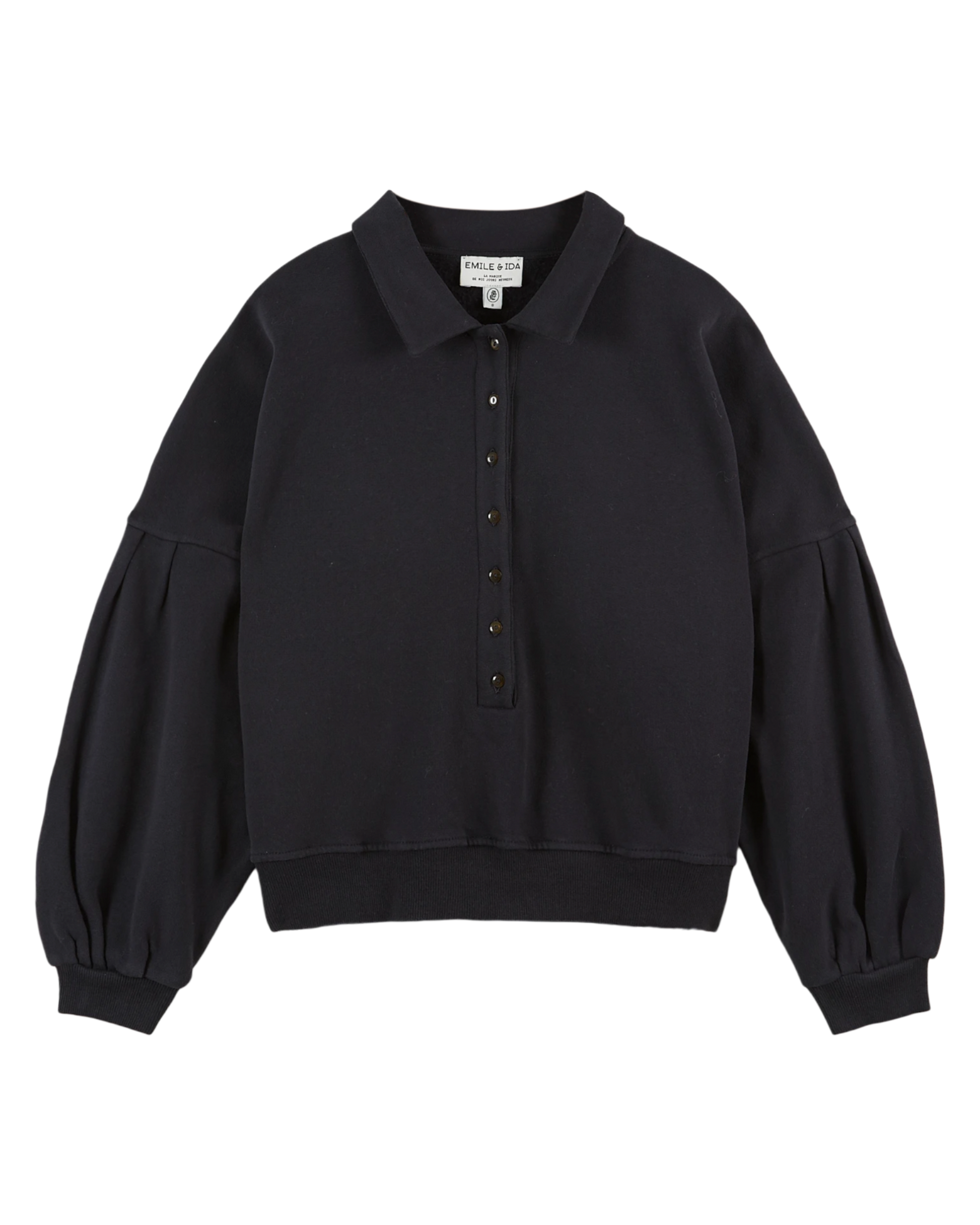 Sweatshirt en coton biologique molletonné et gratté noir bleuté. un sweat qui ressemble à presque tous les sweats mais en beaucoup plus doux : Emmanchures décalées, plis plats et couchés en tête de manches pour faire bouffer, bord-côte ton sur ton aux poignets et autour de la base, surpiqures. L'encolure ras du cou est ornée d'un col pointu et s'ouvre sur la patte de boutonnage qui vous permet de l'enfiler sans vous décoiffer.