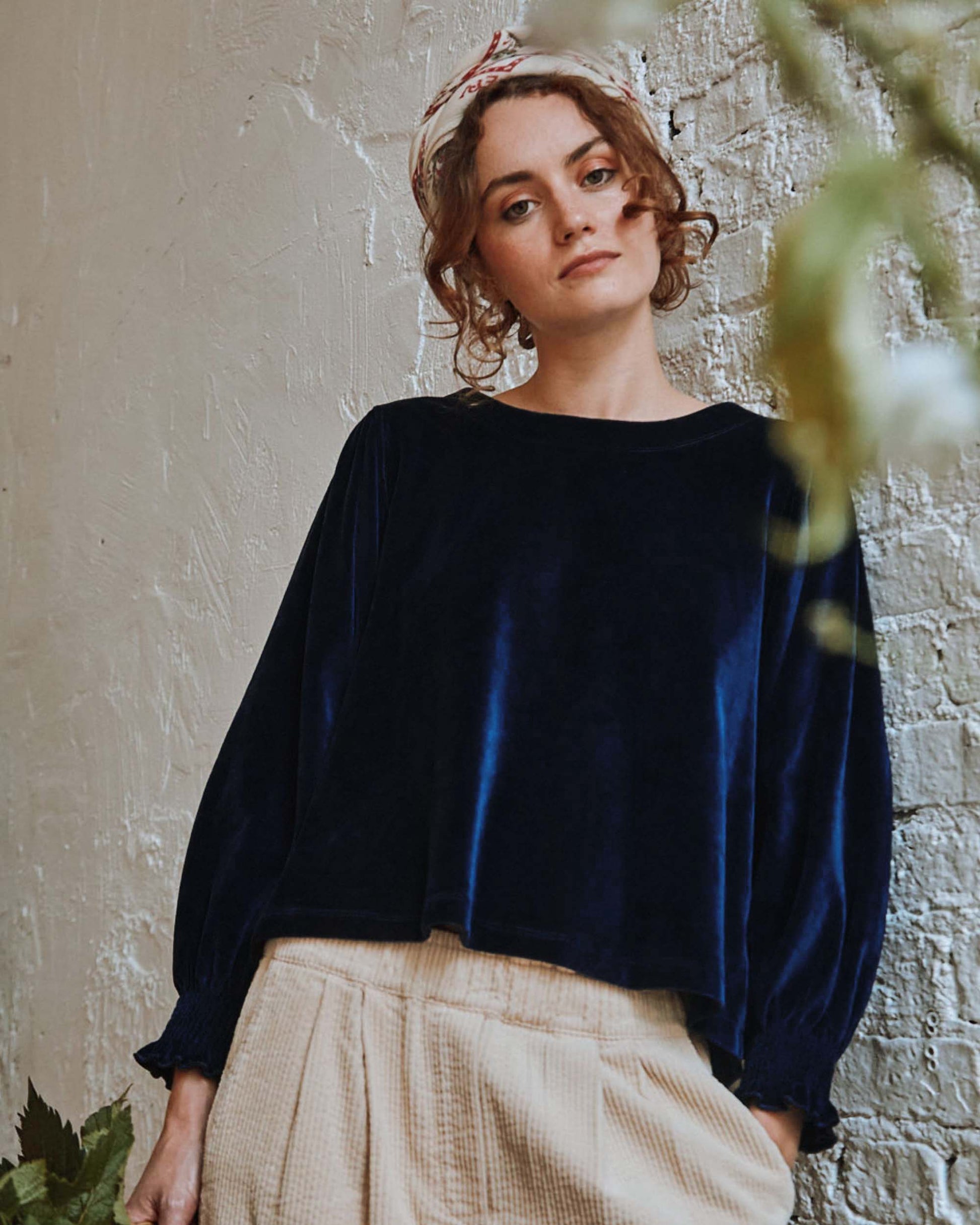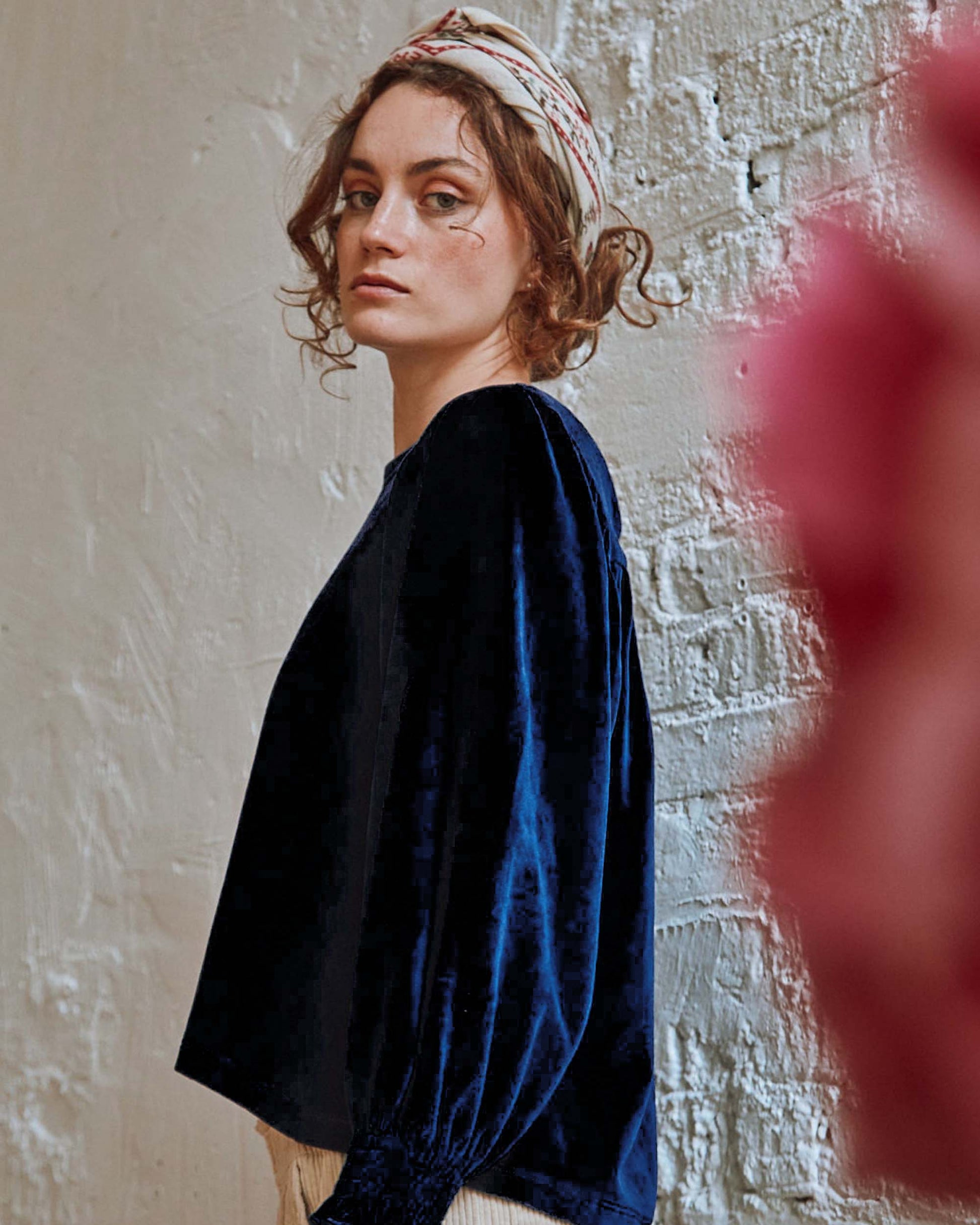 Sweatshirt velours de coton biologique bleu foncé. Un sweat qui ne ressemble aux autres que par sa douceur. Forme ample, sans bord-côte, encolure bateau, grandes entournures sur lesquelles sont accrochées de larges manches resserrées aux poignets par un bouillonné.