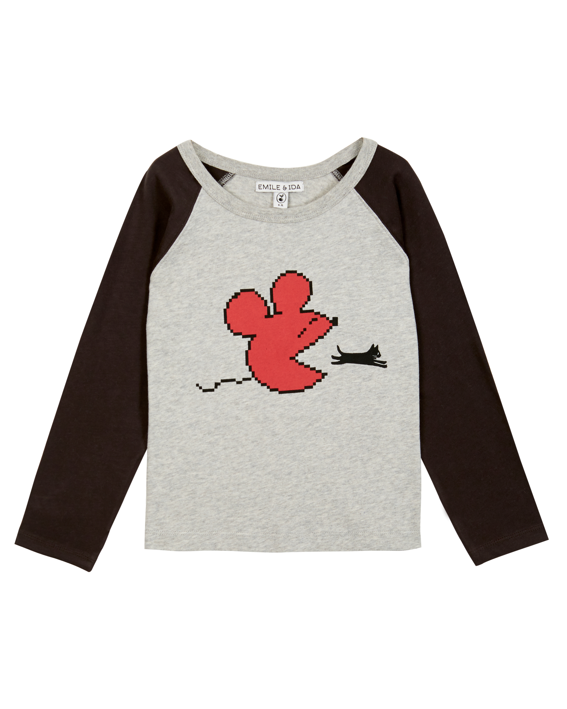 Le raglan des emmanchures surpiqué délimite les couleurs : bitume des manches longues et gris du corps dont le print, souris rouge et chat noir, nous rappelle les premiers jeux vidéo. L'encolure ronde est bordée par un bord-côte gris.