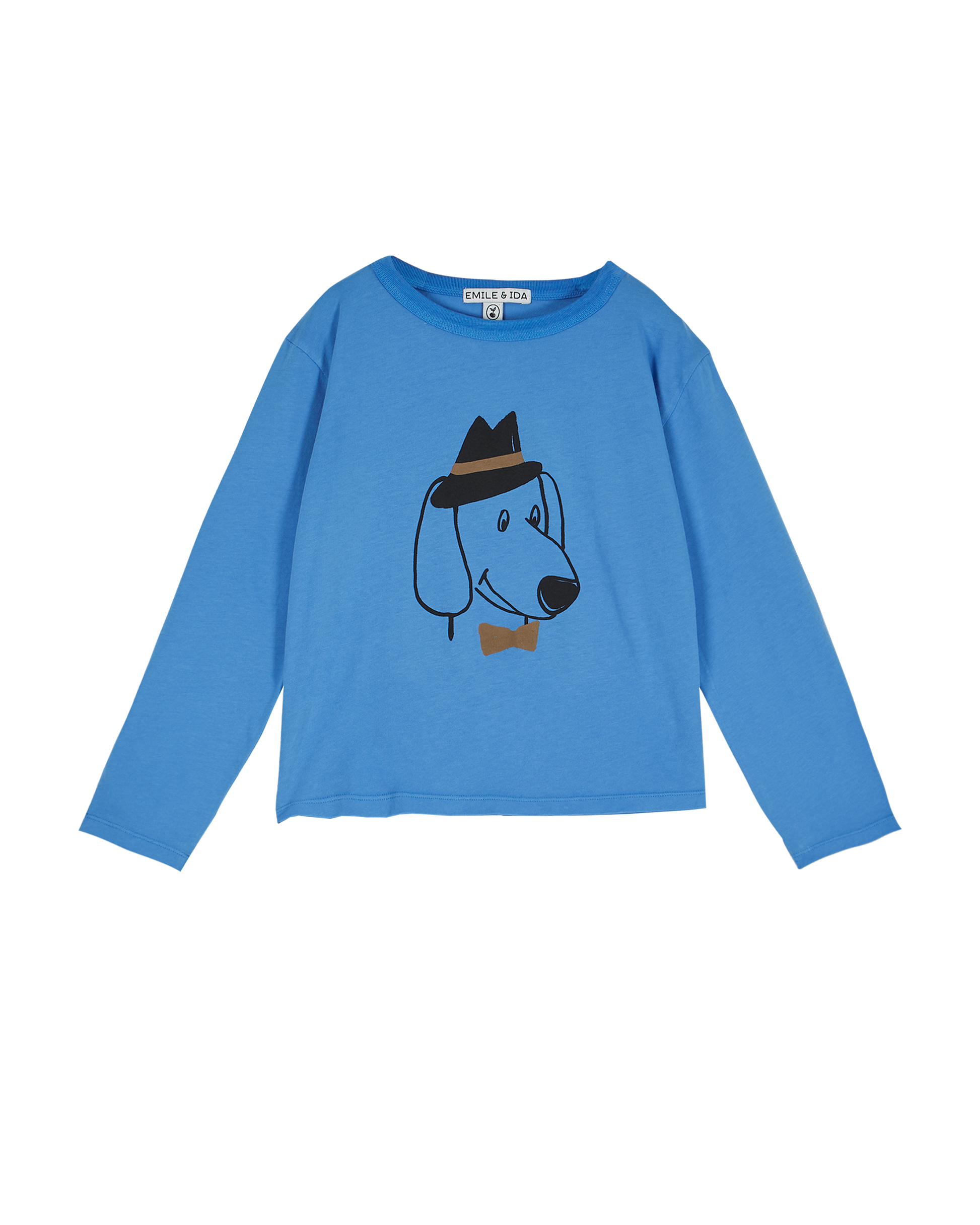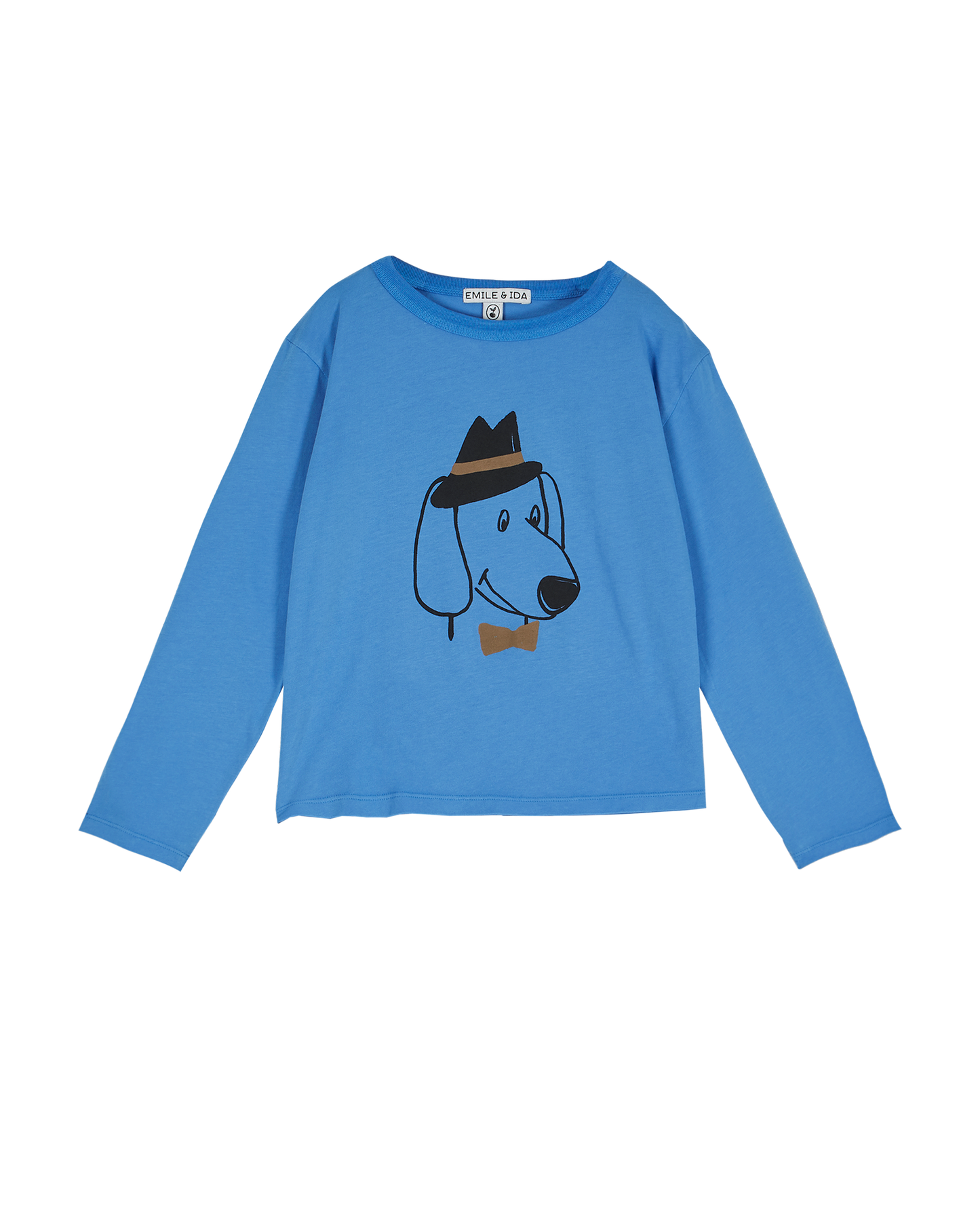 Tee-shirt en jersey de coton biologique imprimé d'un chien souriant sur fond bleu. Il semble bien heureux ce chien avec son chapeau mou et son nœud papillon. Peut-être écoute-t-il du jazz manouche sous les étoiles autour d'un feu de camp.